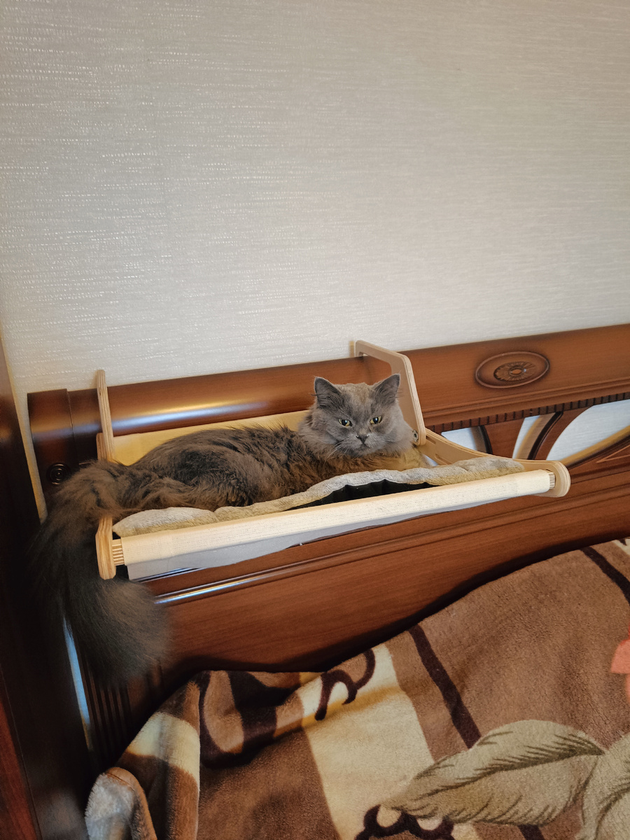 Вот и в этот раз провозилась больше часа, вся вспотела аж. Не раз хотелось и крепкое словцо вставить, чего греха таить, вставлялось. Три раза переделывала, все не туда вкручивала детали. Наконец, справилась. Повесила на кровать.Но как-то не зашло: Маруся обнюхала, но там сидеть отказывалась. И тут меня посетила гениальная идея - повесить гамачок на спинку кровати. Так Маруся будет повыше, а значит и чувствовать будет себя в безопасности. И этот вариант моя принцесса оценила, днем там часто отдыхает, и даже одну ночь провела в нем. Одна проблема, сама запрыгнуть не может пока, я ей туда помогаю залезть.