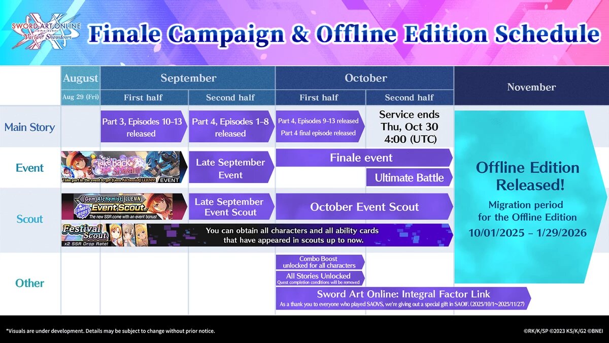 Компания Bandai Namco объявила о том, что 3D-экшен Sword Art Online Variant Showdown прекратит работу 30 октября. В ноябре будет выпущена «офлайн-версия», в которой сохранится часть игровых данных пользователей. Sword Art Online Variant Showdown впервые был запущен для iOS через App Store и для Android через Google Play 22 ноября 2022 года по всему миру. Несмотря на ежедневные усилия по улучшению качества обслуживания с момента запуска, мы в конечном итоге решили прекратить предоставление услуги, придя к выводу, что будет сложно продолжать обеспечивать удовлетворительный игровой опыт. Мы хотели бы еще раз выразить нашу искреннюю благодарность всем, кто поддерживал приложение на протяжении многих лет, а также принести свои искренние извинения за этот неудачный исход. Также разработчики представили дорожную карту обновлений, вплоть до закрытия серверов проекта. https://www.youtube.com/watch?v=PTwL1dbfJL8