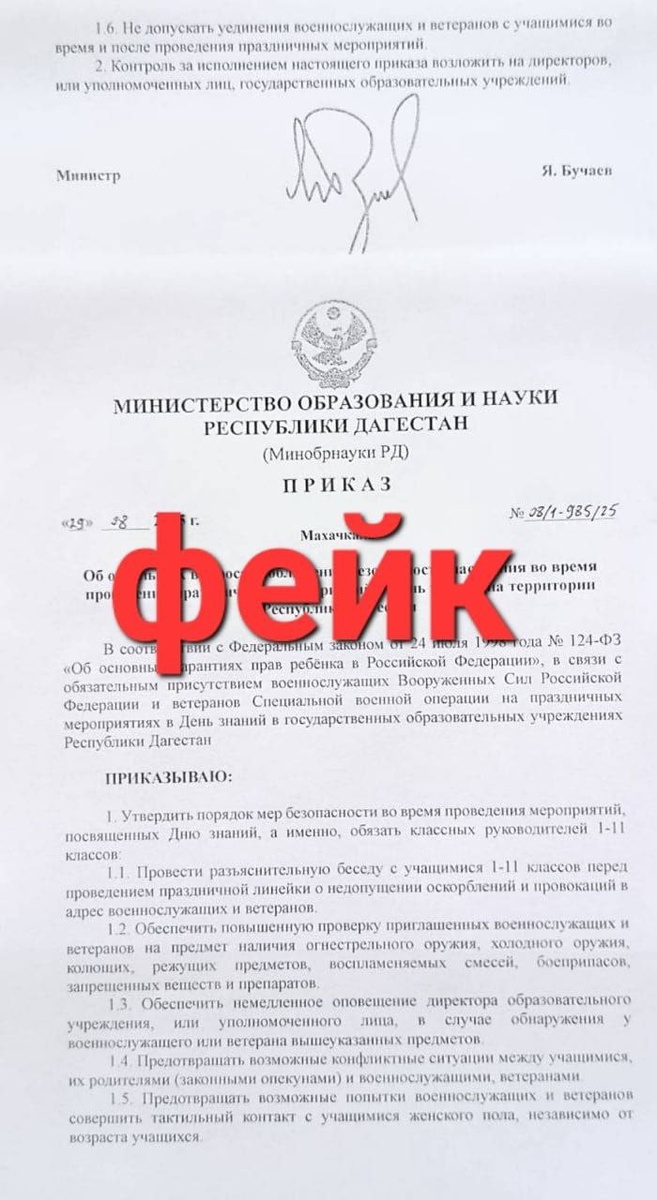 ⚠️ВАЖНО! Министерство образования и науки Республики Дагестан доводит до сведения, что в сети Интернет активно распространяется информация, содержащая недостоверные сведения, касающиеся так называемого "приказа об отдельных вопросах соблюдения безопасности населения во время проведения праздничных мероприятий в День знаний на территории РД". Минобрнауки РД официально заявляет, что данный документ не соответствует действительности, не издавался Министерством и не рассылался ведомством. В этой связи Минобрнауки РД напоминает об ответственности за распространение заведомо ложной и недостоверной информации. Призываем граждан и представителей средств массовой информации руководствоваться исключительно официальными источниками информации и проявлять бдительность при ознакомлении с подобными сообщениями. 🚩 Минобрнауки РД
