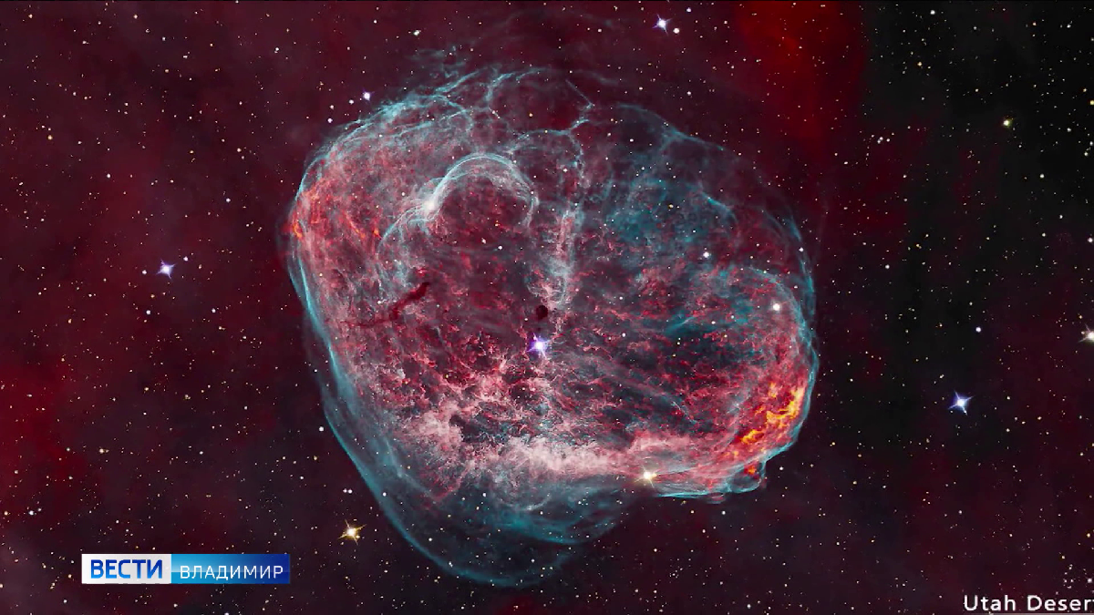 А это объект тоже из созвездия Лебедя. Космическая "загогулина" - туманность "Полумесяц". Она располагается на расстоянии в 4 тысячи 700 световых лет от Земли. ГТРК "Владимир"