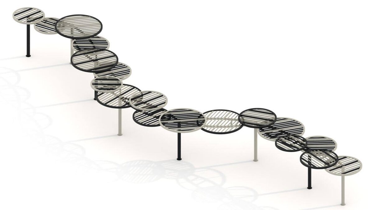 Пергола «Лаунж» Пергола собрана из круглых модулей, объединенных в плавную изогнутую линию. Белые и темные рейки создают характерный рисунок тени. Конструкция остается легкой визуально, при этом работает как защита от солнца. Модульная основа позволяет варьировать протяженность и конфигурацию, подстраивая объект под конкретную площадку. Пергола выступает не только утилитарным элементом, но и архитектурным акцентом, способным задать характер пространства — будь то парк, двор или набережная.