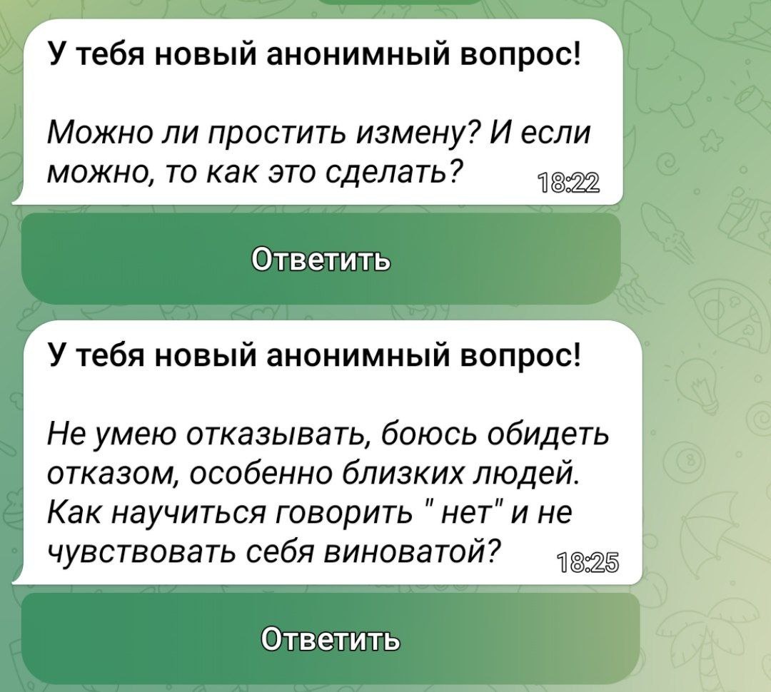 Я всё таки заболела, но могу поотвечать на ваши вопросы. Вот два последних вопроса, которые пришли в анонимных сообщениях . Если вам тоже интересно узнать ответы на эти вопросы - поставьте в комментариях цифру 1 или 2, в зависимости на какой вопрос вам интересно получить ответ. Если хотите задать свой вопрос - вот ссылка http://t.me/questianonbot?start=6039806411c Спрашивайте откуда своих ситуациях и состояниях. Ппогностику на картах в анонимных вопросах не делаю, но относительно карт, работы с ними, значениями вопросы задавать можно