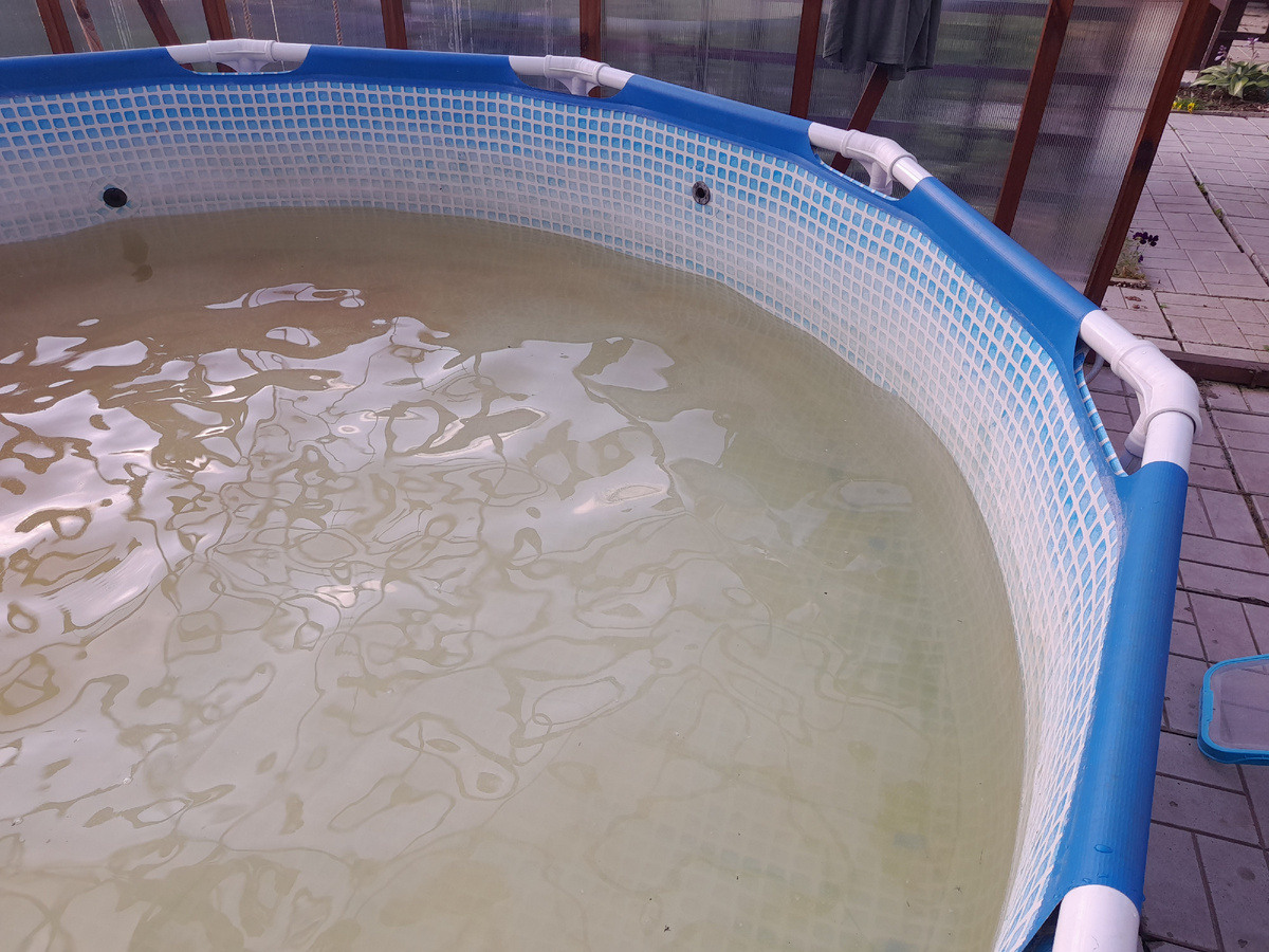 Каждый год в конце августа мы убираем бассейн. Даже если сентябрь еще теплый и вода комфортна для купания, в сторону бассейна мы уже не смотрим. В это время мы перебираемся в квартиру и какое-то время после хозяйствования сына наводим в ней порядок. На дачу приходим редко и нам совсем не до купания. Обычно выбираем теплую солнечную погоду, но в этот раз было прохладно и пасмурно. За ночь через шланг слили воду. Воду в этом году обрабатывали всего пару раз. Она до сих пор прозрачная, но как всегда с рыжим железистым осадком. Далее работаем ковшами и ведрами. Щеткой поднимаем муть и вычерпываем в ведро. Последнюю воду собираем тряпками. Для нас это самая тяжелая и противная работа по обслуживанию бассейна. Не обрабатывать, как многие думают, а именно сливать. После того как все просохло, заклеили порезы. В начале сезона оторвалась заплатка и устранить протечь нам не удалось. Все лето вода потихоньку уходила и приходилось доливать. Второй сезон используем набор для ремонта лодок. Заплатки