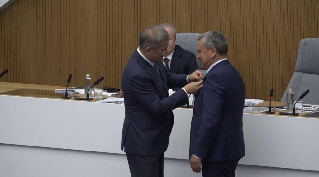 Глава Башкирии Радий Хабиров во время оперативного совещания в правительстве в ЦУРе передал награду, присужденную Республикой Крым председателю Конституционного совета Башкирии Хайдару Валееву. «Мы все его прекрасно знаем, он долгое время на благо нашей республики работал. Вот у него в биографии есть один эпизод, о котором вы не все, может быть, знаете в процессе возвращения Крыма в родную гавань. Крым об этом не забыл. И сегодня прислал вам награду», — сказал Радий Хабиров. Знак отличия Хайдару Валееву присудил Госсовет Крыма. Радий Хабиров вручил юбилейную медаль республики Крым в ознаменование 10-ой годовщины воссоединения. Награжденный отметил, что ему «приятно получить эту награду».