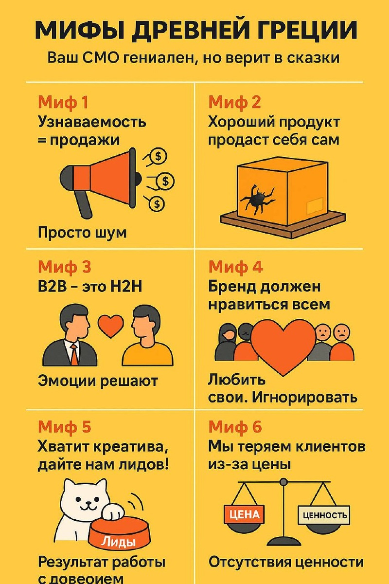 Ваш CMO гениален, но иногда верит в сказки. Итак мифы древней Греции: Миф 1: Узнаваемость = продажи. Правда: Узнаваемость без донесенной ценности — просто шум и слитые бюджеты. Миф 2: Хороший продукт продаст себя сам. Правда: Самый лучший продукт без продуманного маркетинга лежит на складе. Миф 3: «У нас B2B, тут нет места эмоциям» Реальность: B2B — это H2H (Human to Human). Решения все равно принимают живые люди. Эмоции решают. Миф 4: «Бренд должен нравиться всем». Реальность: Сильный бренд — это тот, кого ЛЮБЯТ свои и НЕНАВИДЯТ чужие.Важна лояльность ядра аудитории. Миф 5: «Хватит креатива, дайте нам лидов!» Реальность: Лиды — это не кнопка «продать». Это итог долгой работы с доверием. Можно насобирать пухлую базу с помощью гифки с котиком. Но вам ведь, наверное, нужны платящие, да? Миф 6: мой любимый «Мы теряем клиентов из-за цены». Правда в том, что чаще теряют из-за отсутствия ценности. Есть что-нибудь знакомое? Поговорите со мной.