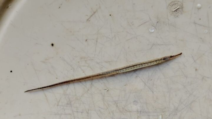 Выловленная рыбка оказалась небольшой — ее длина сравнима с пачкой сигарет. Это уже достаточно взрослая особь, и ее сходство с распрямленным морским коньком не случайно — рыба-игла является «родственницей» морского конька, обитающего в Черном море.