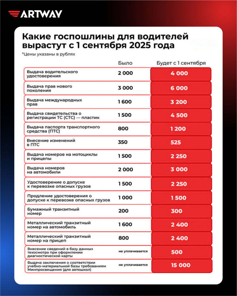 Госдумой принято решение о повышении госпошлин в сфере транспорта, которое запланировано к вступлению в силу с 1 сентября 2025 года. Некоторые изменения: ✅Выдача национального водительского удостоверения. Для документа на пластиковой основе — до 4 тысяч рублей, для удостоверения нового поколения — до 6 тысяч рублей. ✅Выдача международных прав. Вместо 1,6 тысячи рублей — 3,2 тысячи. ✅Получение паспорта транспортного средства (ПТС). Пошлина вырастет в полтора раза — до 1,2 тысячи рублей. ✅Выдача свидетельства о регистрации транспортного средства. Для документа на бумажной основе — 1,5 тысячи рублей, на пластиковой основе нового поколения — 4,5 тысячи рублей. ✅Выдача государственных регистрационных знаков. На автомобили — с 2 тысяч до 3 тысяч рублей, на мотоциклы и прицепы — с 1,5 тысячи до 2,25 тысячи рублей. ✅Выдача металлических госзнаков «Транзит». Пошлина повысится в полтора раза — с 1,6 тысячи до 2,4 тысячи рублей. Для бумажных — до 300 рублей. ✅Выдача и продление свидетельства о до