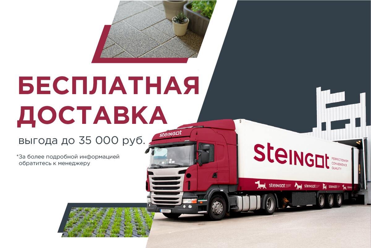 При покупке тротуарной плитки и бордюров из Коллекции COLORMIX и PREMIUM СК 2025 года кратно полной загрузке автомобиля грузоподъемностью 20 т или 10 т доставка на расстояние до 100 км от завода до места разгрузки осуществляется по специальным условиям. Выгоды и преимущества 1 ₽ - стоимость доставки одной фуры 20 000 ₽ - в среднем вы экономите на доставке 10 000 ₽ - в среднем вы экономите на разгрузке, если доставка осуществляется нашим манипулятором 2 дня - в среднем вы экономите на самостоятельном поиске вариантов доставки и разгрузки Одни сутки – срок доставки товара со склада от даты оплаты счета Удобное для вас время – наша доставка работает круглосуточно без выходных ГОСТ 17608-2017 - наша продукция соответствует требованиям стандарта качества и превосходит их Адрес: г. Рязань ул. Большая д. 100 Г. Рязань рынок Стройка Г. Москва Востряковское шоссе д. 7, стр. 6 Г. Тула Карпова 98к2 Для связи: +7 (800) 444-01-36