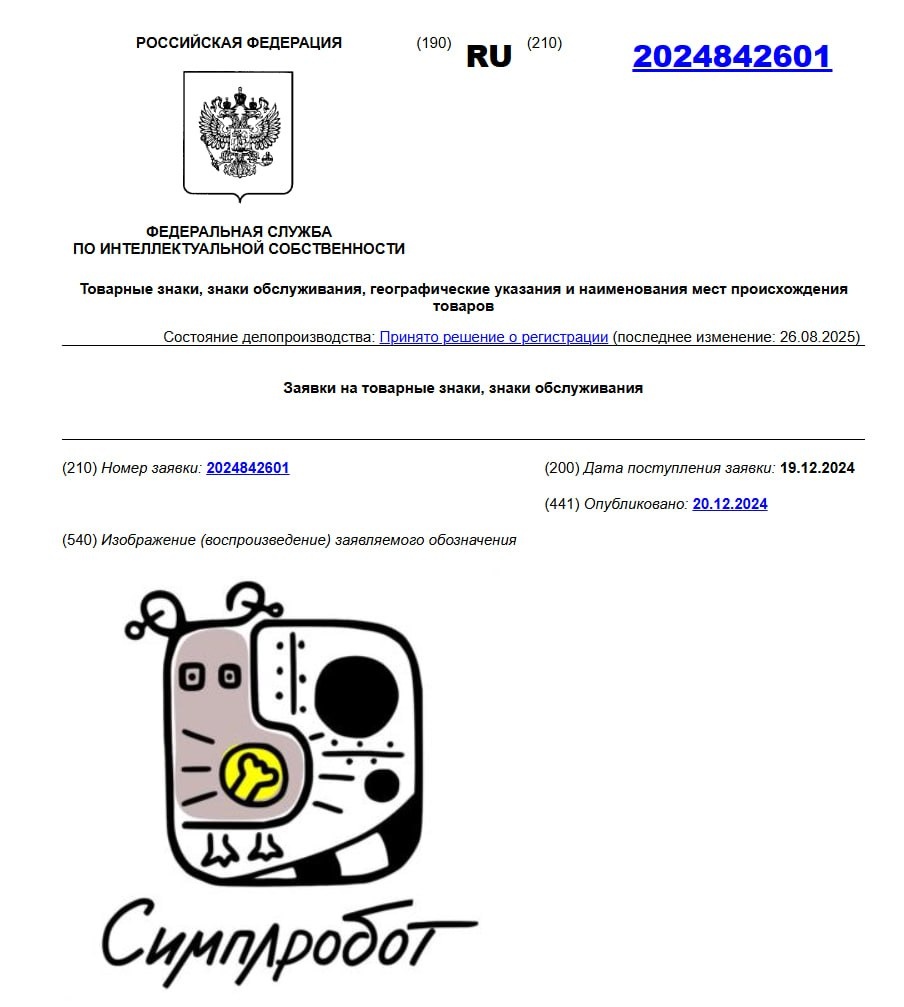 По нашей заявке принято положительное решение о регистрации, мы заплатили пошлину и через 1-1.5 месяца будет официально включены в реестр товарных знаков. А это значит, что СИМПЛРОБОТ в виде нашего маскота-робокрыса становится защищенной торговой маркой для игр и игрушек, компьютерных устройств и программ, а также для услуг по рекламе и разработке/консультации ИТ-систем. ПРОСТОРОБОТ официально закрывается, открывается СИМПЛРОБОТ.