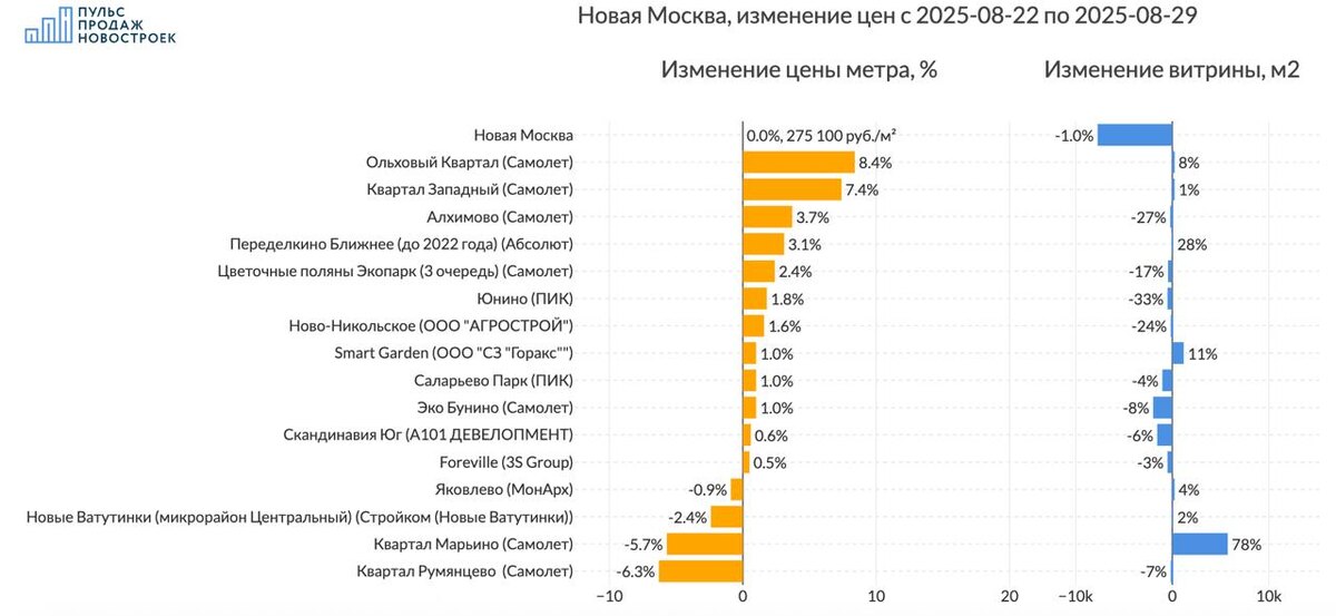 Новая Москва, обзор изменения предложения на рынке за неделю💰 Смотрим без премиум и элит классов. 📈Топ изменения цен (подорожало): 1️⃣ЖК "Ольховый Квартал" (Самолет) цена метра +8.4%, объем витрины при этом увеличился на 246м2 2️⃣ЖК "Квартал Западный" (Самолет) цена метра +7.4%, объем витрины при этом увеличился на 224м2 3️⃣ЖК "Алхимово" (Самолет) цена метра +3.7%, витрина предложения уменьшилась на -213м2 🪫Анти топ (подешевело): 1️⃣ЖК "Квартал Румянцево" (Самолет) -6.3% в цене, витрина предложения уменьшилась на -110м2 2️⃣ЖК "Квартал Марьино" (Самолет) -5.7% в цене, объем витрины при этом увеличился на 5744м2 3️⃣ЖК "Новые Ватутинки (микрорайон Центральный)" (Стройком (Новые Ватутинки)) цена метра -2.4%, без изменения объема предложения ☄️Объем предложения жилья в регионе ниже -1.0% (-7729 м2) Все изменения в регионе на картинке, ставьте 🔥если хотите посмотреть на Санкт-Петербург. 🔥 @pulsprodaj