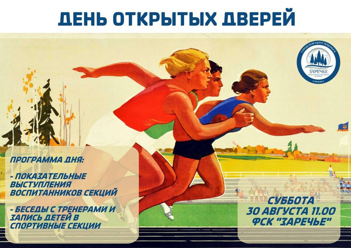 ✨ День открытых дверей в Заречье Программа дня: 🌷Показательные выступления воспитанников секций 🌷Беседы с тренерами 🌷Запись детей в спортивные секции 📆 30.08.2025 🕒 11:00 🏢 ФСК "Заречье" 📍 г.о. Подольск, мкр-н Климовск, Спортивный пр., д. 4, корп. 3 💰 Вход свободный❗️ #webПодольск ⭐Поддержать канал голосом 💰 Вакансия - курьер в Подольске ✅ Мероприятия Подольск https://dzen.ru/id/66ed500f7b5671493eca3fd6 http://vk.com/podolsk_events http://dzen.ru/podolsk_events