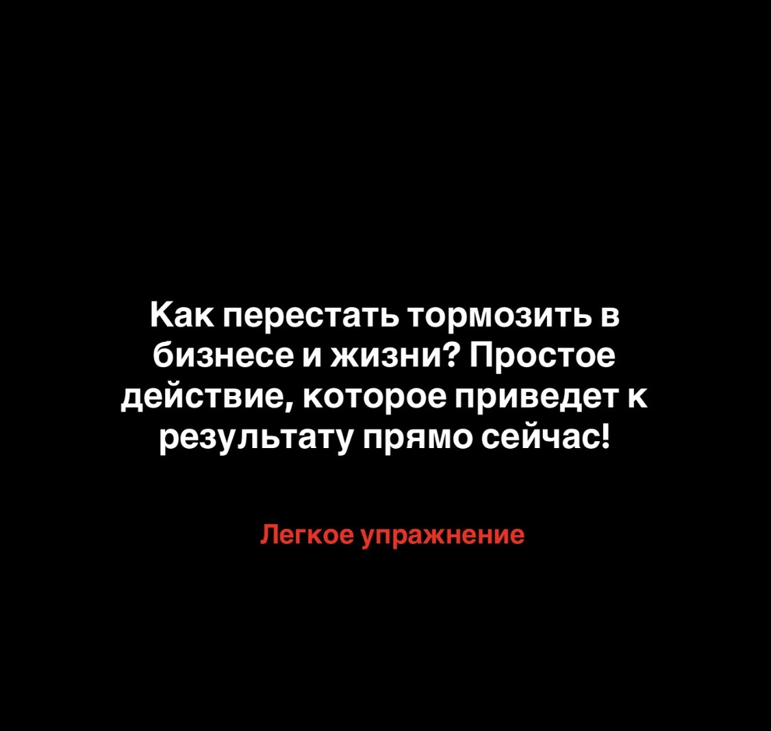То и дело в работе вижу, как бизнесмены постоянно «тормозят» и не могут выйти на новый уровень. Все дело в отсутствии фокуса и энергии. Без этого весь бизнес и личная жизнь — это просто бег на месте. Простое действие, сделанное прямо сейчас, начнет менять положение дел. Простое действие, сделанное прямо сейчас, начнет менять положение дел. 1: Найди 5 минут на абсолютную тишину и сосредоточенность. Сядь в удобное место, закрой глаза, сделай несколько глубоких вдохов. Не думай ни о чем. 2: Прямо сейчас задумайся, что действительно важно для твоего бизнеса или жизни в данный момент. Остановись. Что тебе нужно для выхода из сложившейся ситуации? Это может быть решение вопроса с партнером, принятие решение или постановка амбициозной цели. 3: Зафиксируй это на бумаге или в заметках. Простой акт записи заставляет твой мозг работать по-другому и находить путь. Почему это эффективно. Эти 5 минут концентрации и ясности позволят вернуть фокус и энергию. Ты перестаешь прокрастинировать
