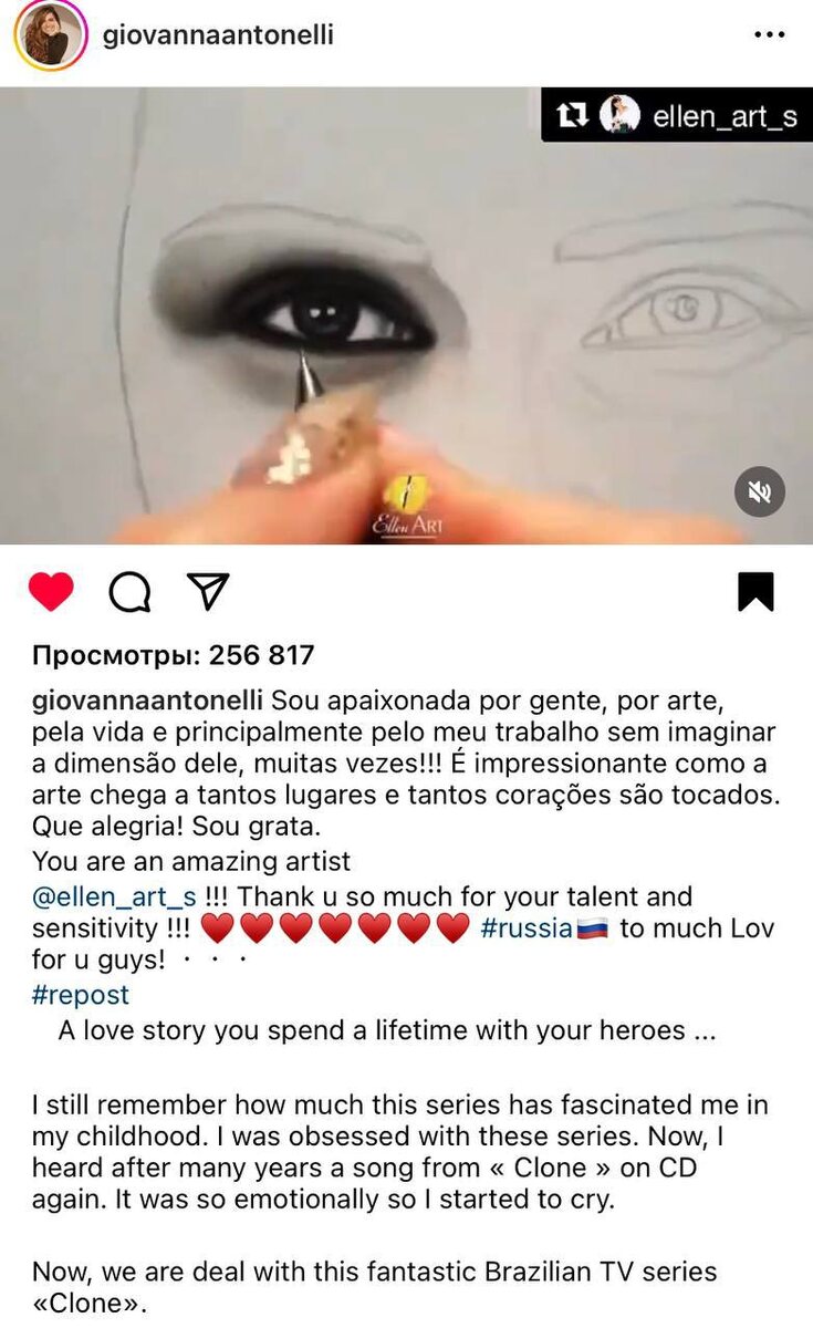 А теперь самое невероятное… Это видео с портретом Жади набрало больше 200.000 просмотров буквально за пару часов. Но главное даже не в цифрах, а в том, что его увидела сама актриса😳 Она написала мне, оставила комментарии и выложила у себя на странице. Для меня это было что-то… из разряда «нереально». Когда человек, которого ты видел только на экране, вдруг видит твою работу. Когда детская любовь к сериалу превращается в такую настоящую связь. И раньше это казалось недосягаемым. А сейчас…интернет стирает границы. Можно заниматься любимым делом, делиться им и находить людей, которые откликнутся. Даже если это сама Джованни Антонелли 💔 Я тогда поняла одно: твой труд и твое творчество точно кого-то коснётся. Главное — показывать его.