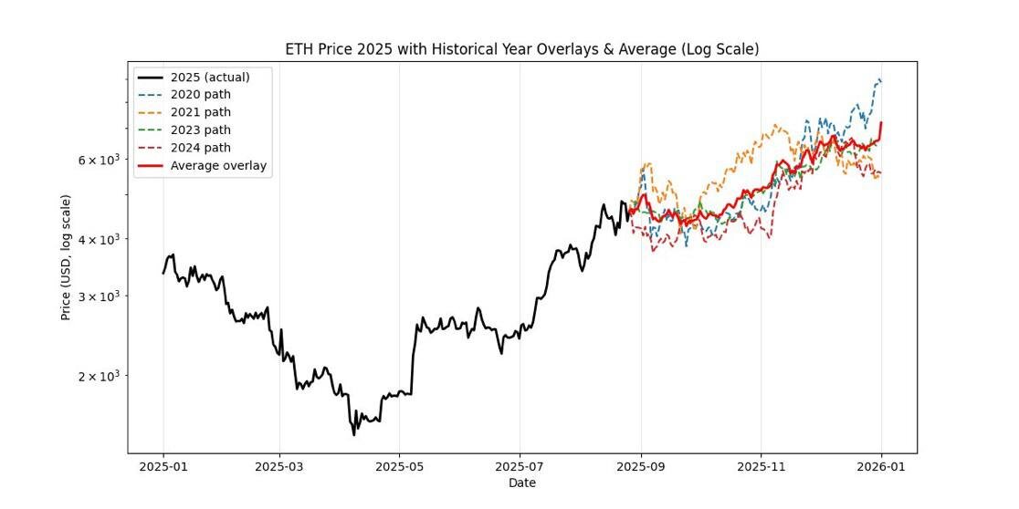 Ethereum показывает любопытную сезонность На графике видно, что динамика 2025 года (чёрная линия) начинает всё больше совпадать с усреднёнными траекториями прошлых лет (цветные линии). Если экстраполировать этот паттерн, то до конца года среднее движение для ETH остаётся восходящим: ноябрь–декабрь традиционно приносят рост. Что это значит? Исторически Ethereum в конце года часто показывает ускорение цены. Усреднённое наложение прошлых лет (красная линия) указывает на вероятность плавного роста до конца 2025-го, хотя разброс сценариев остаётся заметным — от умеренного роста до более агрессивного рывка. Сезонность не даёт гарантий, но показывает вероятности. ETH уже вернулся к уровню, согласующемуся с историческими трендами, и если сезонный паттерн сохранится, рынок может продолжить восходящее движение. Хотите, разберём подробнее — какие именно годы больше всего влияют на усреднённый сценарий и где сезонность для ETH работает лучше всего? #Ethereum #ETH #крипторынок #сезонность