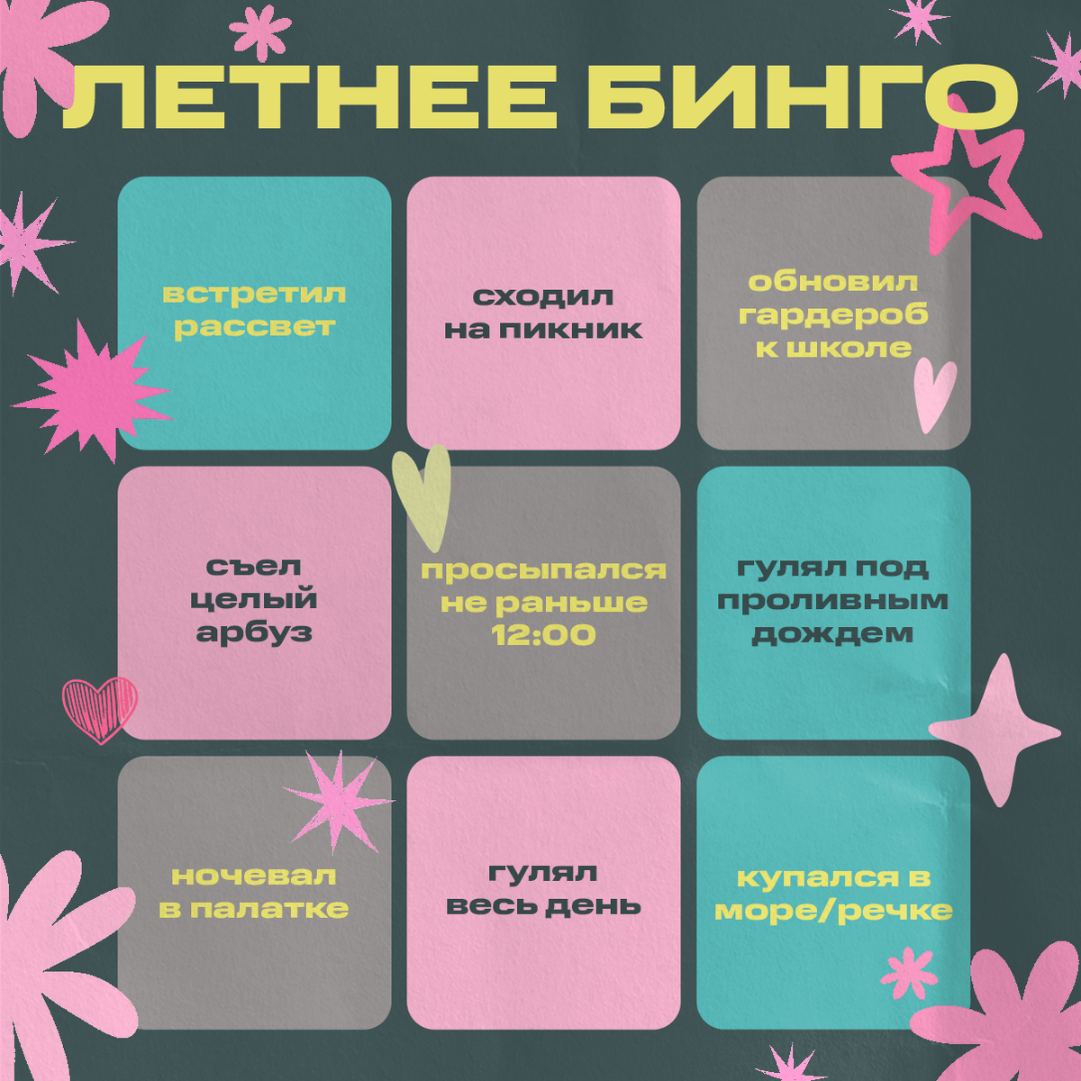 Смотрите наше бинго и отмечайте пункты, которые успели сделать.