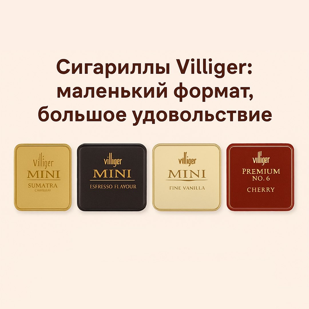 Не знаешь, что выбрать для короткой, но насыщенной паузы? Обрати внимание на наши Villiger Mini-сигариллы — отличный выбор с мягким вкусом и стильной подачей. 🔥 Что есть в наличии: Villiger Mini Sumatra Classic — классика с мягкой табачной сладостью. Villiger Mini Espresso Flavour — с акцентом на насыщенный кофе. Villiger Mini Fine Vanilla — деликатная ванильная мягкость. Villiger Premium No. 6 Cherry — сочная вишнёвая сладость. Villiger Premium No. 3 Sumatra — сбалансированный табак с лёгкой пряностью. 🥂 С чем сочетать? Sumatra Classic → сухое белое вино или лёгкий ром. Espresso Flavour → эспрессо или тёмное пиво. Fine Vanilla → кофе латте или ликёр Baileys. Cherry → глинтвейн или коньяк VSOP. No. 3 Sumatra → виски или выдержанный ром.