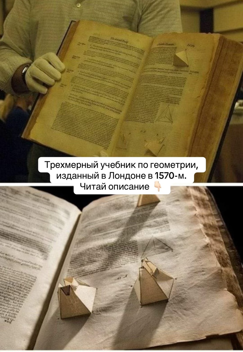 Трехмерный учебник по геометрии, изданный в Лондоне в 1570-м. Но в его основе все те же знаменитые «Начала» Евклида, прослужившие учебником больше двух тысяч лет, - по ним даже Пушкин в Лицее учился. Наш телеграмм канал 🎁😉 t.me/dumai_russia Наш ВК https://vk.com/dumai_russia