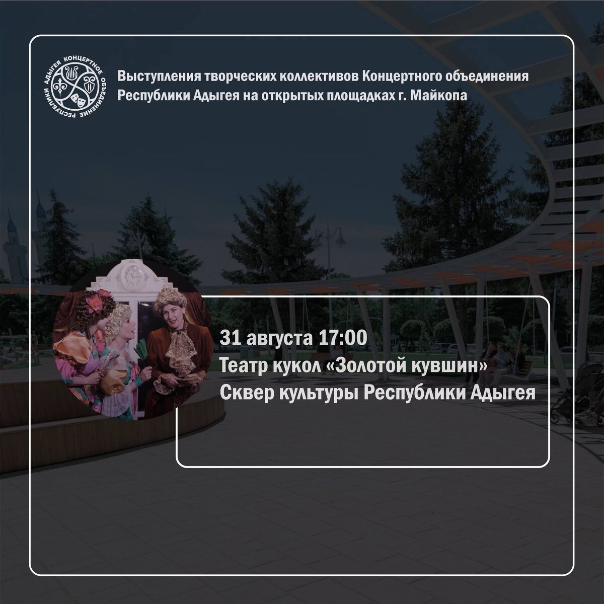 Воскресные концерты творческих коллективов Концертного объединения Республики Адыгея на открытых площадках города Майкопа. 31 августа: 🔹в 17:00 - выступление театра кукол «Золотой кувшин» в Сквере Культуры Республики Адыгея. 🔹в 18:00 - выступление Камерного музыкального салона на эстраде «Ракушка» Городского парка культуры и отдыха. Ждём вас! ☀️Мероприятия состоятся только при благоприятной погоде #новости_минкульт_РА #КОРА #РеспубликаАдыгея #Победа80