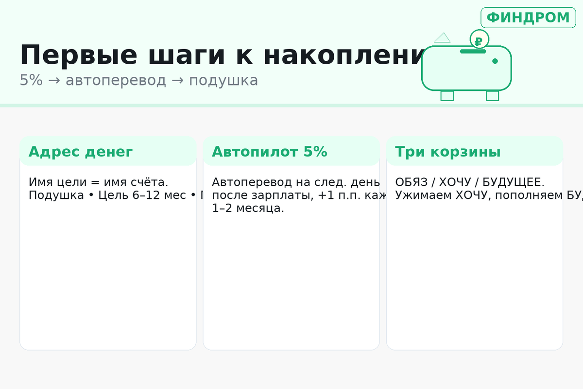 Накопления — это не «когда-нибудь, если звёзды сойдутся», а повседневная техника безопасности для кошелька. Без них любая простуда бюджета превращается в пневмонию. Хорошая новость: стартовать можно сегодня, без героизма и даже без отказа от кофе. «ФИНДРОМ» — про простые шаги, которые дают результат уже в первый месяц. Деньги плохо слушаются абстракций. Дайте им адрес: подушка, цель на 6–12 месяцев (отпуск, курсы, техника) и «большая мечта». Имя цели = имя счёта. «Копилка №3» не мотивирует, а «Отпуск Сочи август» — уже да. Секрет накоплений — не сила воли, а автоперевод на следующий день после зарплаты.