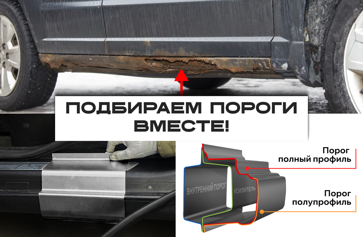 Ржавчина разная - решение одно! Подбираем детали для кузова Что нужно владельцу авто с подгнивающим кузовом? Быстро и надолго решить эту проблему. Не искать детали по разборкам, не маяться в очереди на СТО, а закрыть кузовной вопрос. Кто-то восстанавливает пороги самостоятельно, кто-то обращается к мастеру, но все знают - чем глубже проблема, тем дороже обойдется ее решение (и речь не обязательно о деньгах): Сквозные дыры, пена в порогах, наслоения продуктов коррозии, труха - что со всем эти делать? Во-первых, определить повреждения! Ржавчина может задевать только ту часть порога, которая находится на улице. В этом случае вам потребуется полупрофиль. Берете болгарку, отрезаете ржавый металл, тщательно зачищаете кузов, и привариваете новый порог полупрофиль! 📌 Никогда нельзя забывать про обработку металла до и после сварки! Разница наглядно Если ржавчина поднялась выше, к уплотнительной резинке салона, то ваш выход - пороги полного профиля. Они полностью перекрывают повреждения: как