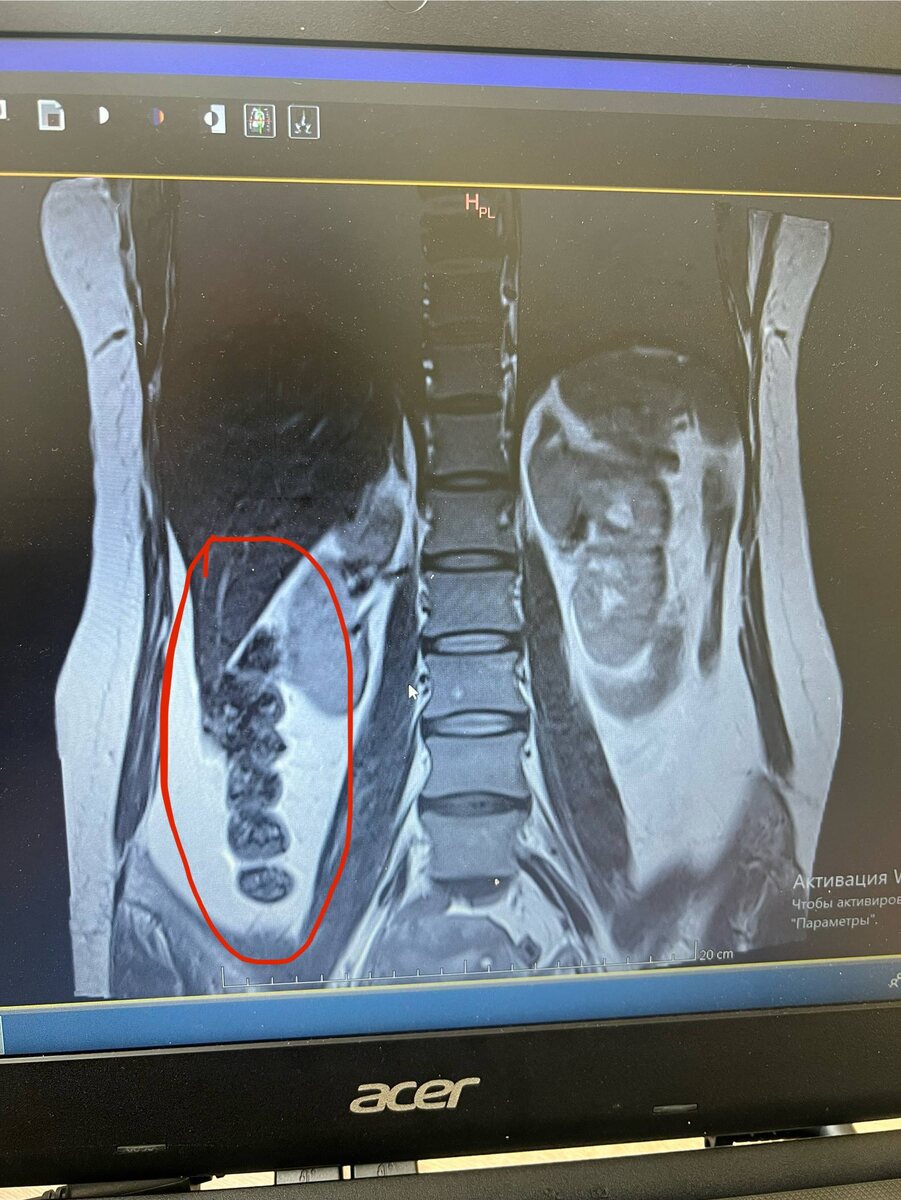 Обращение с болью в спине закончилось отказом в приеме и направление к другим специалистам 🤯 Сегодня обратился пациент с проблемой в спине уже месяц болит, неделю идет обострение. Лучше всего стоять. Лежать на животе сильная боль, на правом боку сильная боль, также дискомфорт и в положении на спине, когда встает, садится и сидит тоже боли 😵💫 Дополнительные жалобы: отекают ноги Конечно же, в опросе указано, что никаких заболеваний нет, никаких проблем с организмом нет и не было, только вот спина болит 🤔 На снимке МРТ (слева на кадре) четко видно восходящую часть кишечника, обычно такое не заметно на МРТ, только отголоски, а также на других снимках просматривается возможная проблема с маткой (вероятно миома) Чтобы вы понимали в описании к МРТ этих данных нет👎 Итог: скорее всего у пациента воспаление кишечника, которое приводит к сдавливанию почки, а также проблемы репродуктивных органов, а сам позвоночник в неплохом состоянии, за исключением сломанного копчика и местами идет