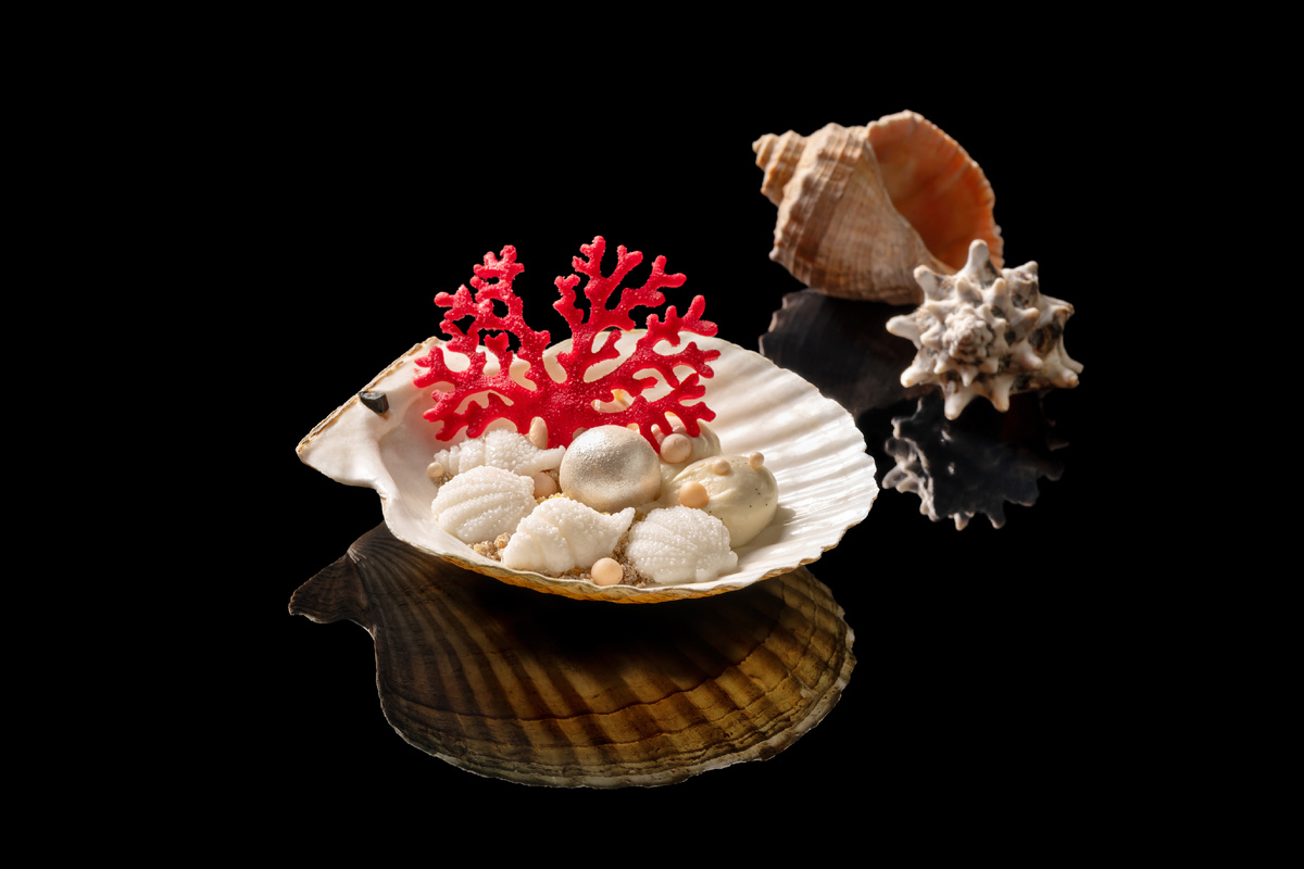 В раковине морского гребешка Юлия Туцкая создала арт-инсталляцию с гармоничной палитрой вкусов, которые напоминают о далеких тропических островах. На бисквитном пляже, в окружении медовых кораллов и диковинных кокосовых ракушек находится драгоценная жемчужина из освежающего ананасового лимонада.