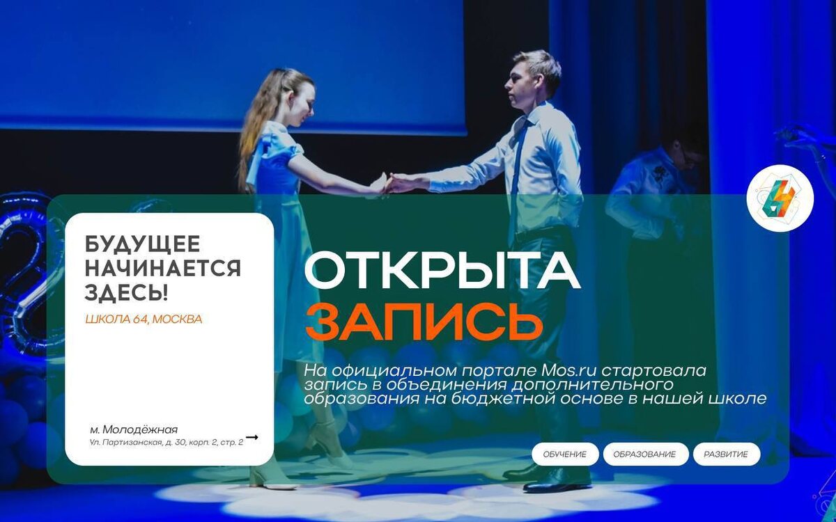 На официальном портале Mos.ru стартовала запись в объединения дополнительного образования на бюджетной основе в нашей школе. Это уникальная возможность для детей развивать свои таланты и навыки, получая качественное образование вне школьной программы