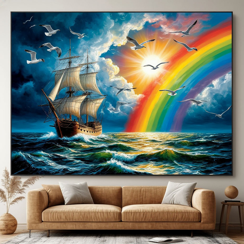 К утру картина преобразилась. Бурный морской пейзаж все еще был виден, но теперь его смягчали яркое солнце, белые чайки и даже небольшая радуга, появившаяся над горизонтом.