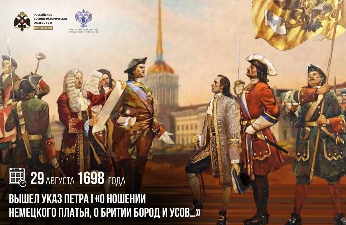 29 августа 1698 вышел указ Петра I «О ношении немецкого платья, о бритии бород и усов…»