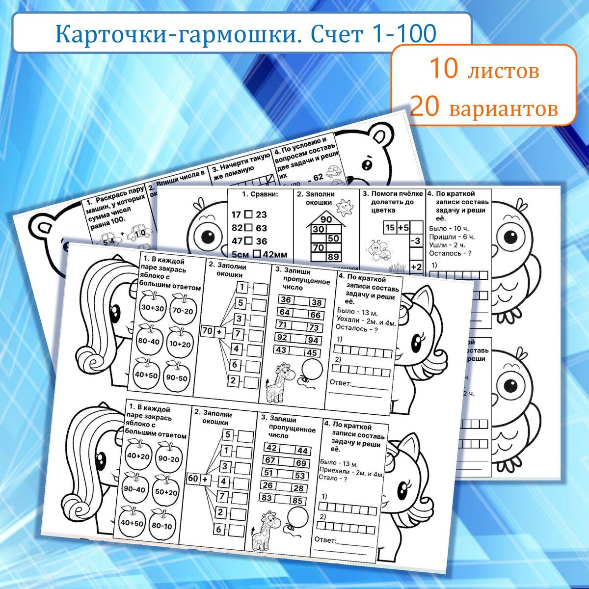 Карточки-гармошки скачать здесь Карточки-гармошки по математике предназначены для учащихся 2 класса Устные приёмы вычисления от 1 до 100. (1 полугодие). В наборе 10 листов с заданиями и 10 листов с ответами для самопроверки. На каждом листе два варианта заданий. ИТОГО 20 разных карточек. Данный дидактический материал можно использовать как на уроке для работы по вариантам, так и воспользоваться вторым вариантом для работы над ошибками. Конечно же, данная разработка будет полезна и для занятий дома. После того, как ребёнок выполнит задания, карточка сгибается по вертикальным линиям гармошкой, в результате чего из половинок получается цельная картинка, готовая для раскрашивания. Ребенку будет интересно! Использование карточек-гармошек позволяет в нетрадиционной форме закрепить материал и развивает интерес к предмету. Размер клеток на карточке удобен для работы. Задания разнообразны. Есть и алгебраический, и геометрический материал. В каждой карточке предусмотрена работа над задачей.