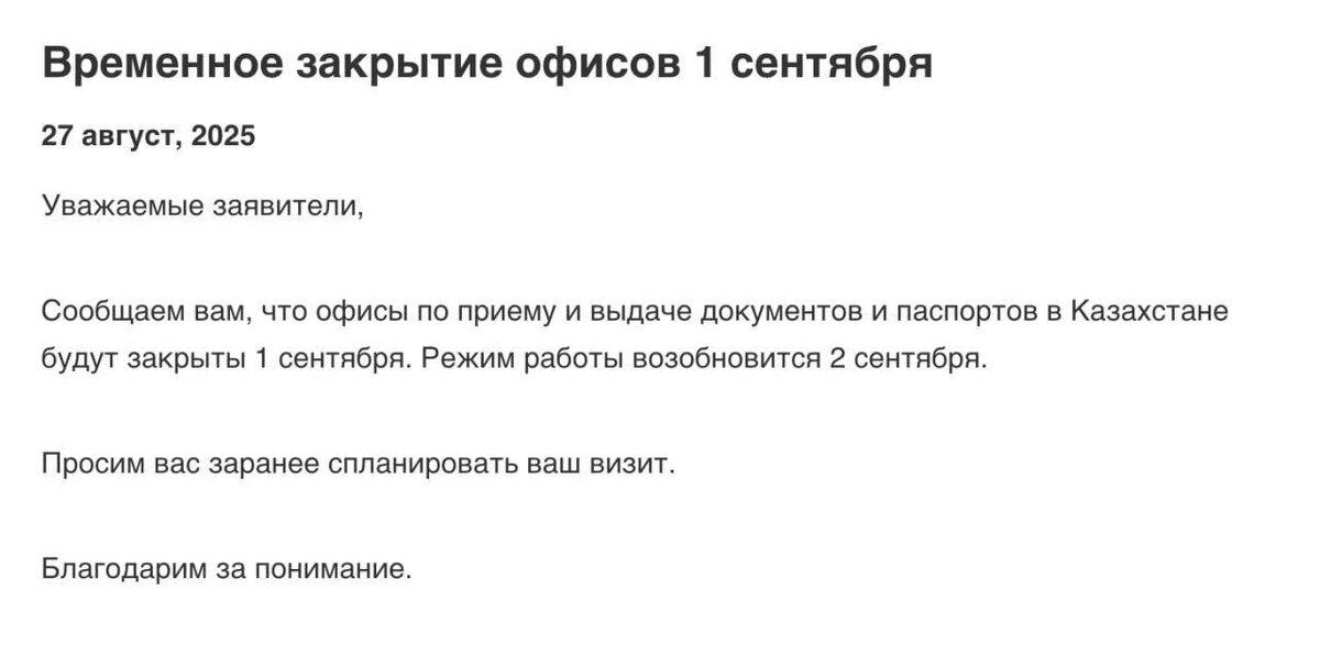 ❌ Сообщаем, что офисы по приёму и выдаче документов и паспортов в Казахстане будут закрыты 1 сентября
