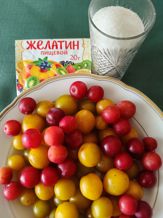 Слива порадовала в этом году щедрым урожаем. Удалось и вареньице сварить, и пироги испечь, но более всего балую себя желе с желатином. Польза желатина известна. Он состоит из коллагена – белка, который составляет основу соединительной ткани человеческого организма (сухожилия, кости, хрящи). Именно коллаген обеспечивает прочность костной ткани и гибкость суставов, способствует образованию новой ткани и ускоряет процесс восстановления при заживлении ран, формирует каркас, который поддерживает и защищает органы от повреждений, предотвращает появление морщин и увлажняет кожу, укрепляет структуру волос и ногтей. Одним из источников коллагена является желатин, который получают путём длительного вываривания костей животных. Для поддержки организма в долгий зимне-весенний период предлагаю приготовить желе из сливы с желатином. Список ингредиентов: 1. Слива желтая – 1 кг; 2. Сахар – 350 – 400 г; 3. Желатин пищевой – 1 столовая ложка. Время приготовления – 1 сутки. Подготовить продукты. Отобрать