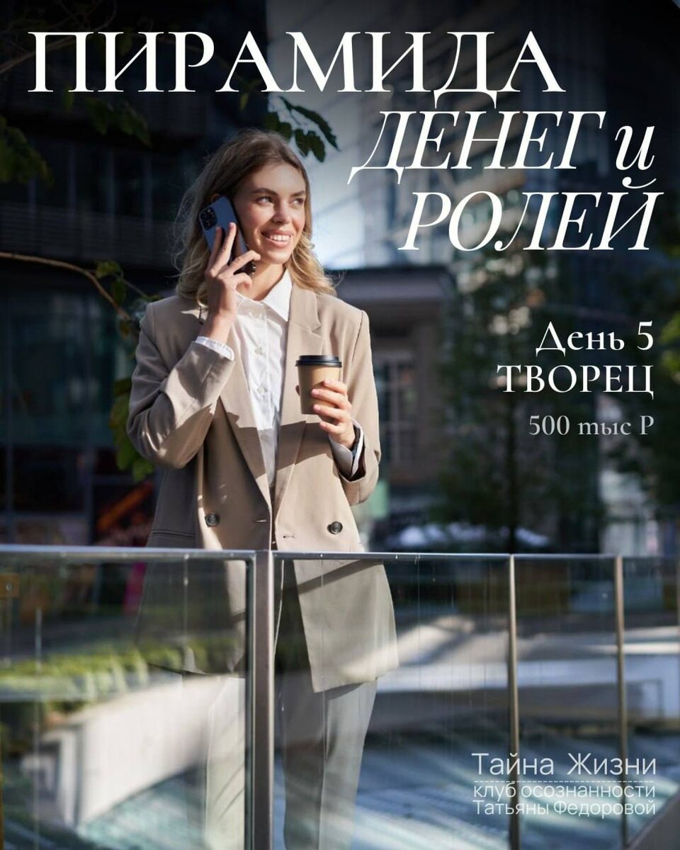 ПИРАМИДА ДЕНЕГ И РОЛЕЙ 🔹 День 5 Творец (500 000 ₽+) Пример: — Три проекта сразу? — Конечно! У меня столько идей! Я кайфую от процесса, а деньги сами подтянутся. Творец живёт из вдохновения и игры. 💸 Деньги приходят легко, когда идеи воплощаются. Вопрос: Что тебе мешает сегодня сыграть свою идею — без страха и оценки? Практика: Запиши 3 идеи, которые тебя вдохновляют. Одну из них начни пробовать уже сегодня.