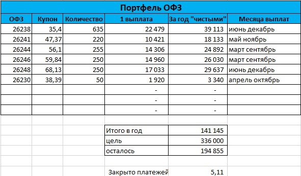 Всех приветствую, Прошел 3й квартал и пора поделиться итогами по портфелю появившемуся как ответ на ипотечный кредит. 2й квартал был закрыт на отметки 4,5 платежа С тех были и купоны и пополнения на 100.000 с кварталки и вот отметка в 5 платежей преодолена Так что цель на этот год выполнена, а дальше 6 платежей (т.е. де факто платеж уменьшается для меня в 2 раза) и возможно потом я перейду к досрочке, а не наращиванию этого портфеля, пока все купоны с него реинвестируются. Но это будет в первую очередь зависеть от того под какую ставку будут размещения. Тем более квартира сдается в первой половине следующего года и часть вкладов и доходов уйдет в ремонт. Более оперативно я пишу в своей телеге