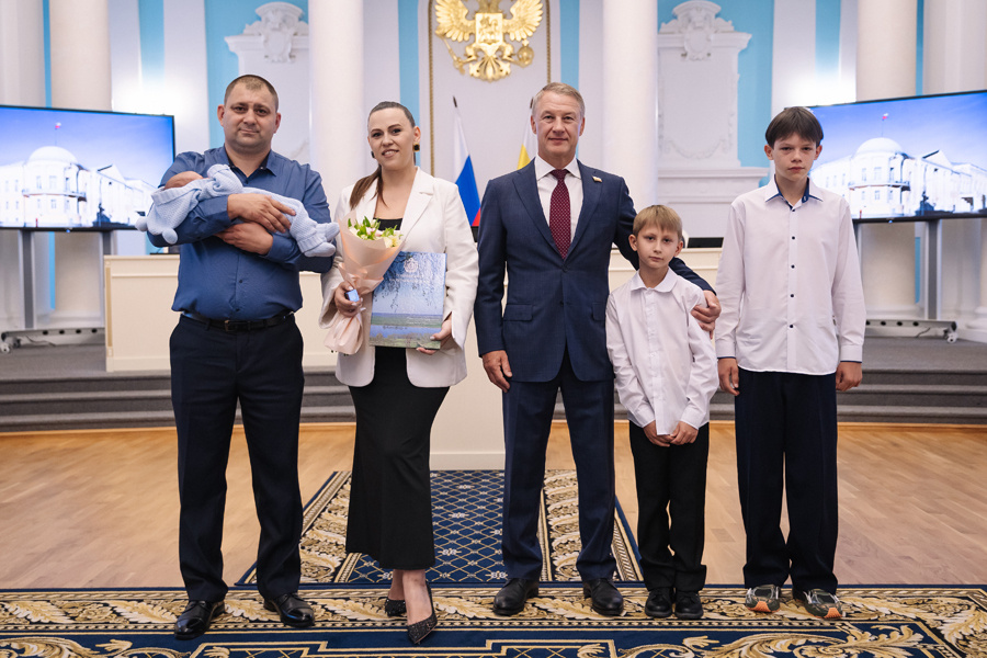 В пятницу, 29 августа, в Гербовом зале Рязанской областной Думы состоялась торжественная церемония регистрации новорожденного. С радостным событием родителей малыша – Маргариту и Дениса Кадушкиных – поздравил спикер регионального парламента Аркадий Фомин. В праздничном мероприятии также приняла участие начальник главного управления ЗАГС Рязанской области Елена Сорокина. Супруги Кадушкины вместе уже больше 15 лет. Денис работает в сфере подбора автомобилей, Маргарита – сотрудница муниципального учреждения культуры, ведущая мероприятий. В семье подрастают трое сыновей. Старшему Кириллу 14 лет. В свободное от учебы время он занимается брейк-дансом и разучивает трюки на самокате. Девятилетний Дмитрий старается ни в чем не уступать старшему брату: практикуется в спортивных уличных танцах и уже неплохо катается на самокате. Младший ребенок появился на свет в середине августа текущего года. Мальчику дали имя Матвей. С важным событием в жизни семьи чету Кадушкиных тепло поздравил председатель