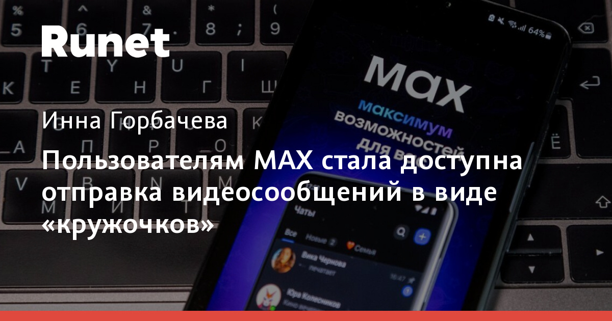 Мессенджер MAX запустил формат коротких видеосообщений в круглом оформлении: «кружочки» можно записывать и отправлять мгновенно, максимальная длительность — до 60 секунд; для доступа к функции нужно обновить приложение, запись запускается через иконку камеры с жестом вверх, доступны пауза, возобновление и предпросмотр, а также фронтальная подсветка и эффект Zoom. Об этом сообщает пресс-служба MAX. «Для записи и отправки кружка необходимо нажать на иконку камеры в правом нижнем углу и провести пальцем вверх по экрану. Запись можно остановить и возобновить в любой момент, а также пересмотреть видео перед отправкой. Максимальная длительность кружка — 60 секунд», — сообщили в пресс-службе мессенджера. По данным сервиса, по состоянию на 19 августа в MAX зарегистрировались более 18 млн человек; с момента запуска пользователи отправили свыше 200 млн сообщений и совершили около 30 млн звонков, включая групповые видеозвонки. Напомним, ранее стало известно, что в России может появиться отечественный аналог Instagram* в «периметре» национального мессенджера MAX. * Запрещен, принадлежит корпорации Meta, которая признана экстремистской организацией и запрещена в РФ
