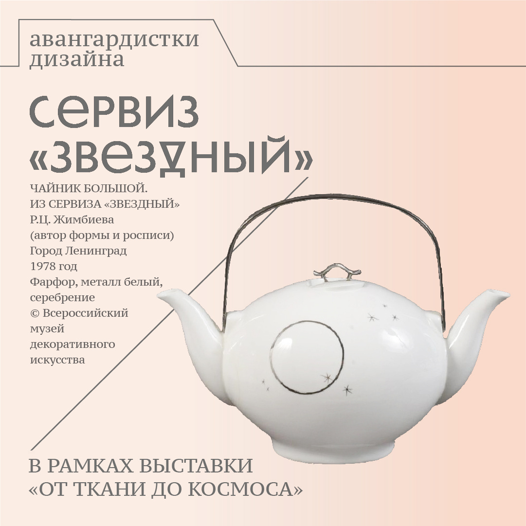 Очень много «звездных» экспонатов ждут вас на выставке «От ткани до космоса. Авангардистки дизайна»! Сегодня мы расскажем про один из них — сервиз «Звездный» Рыгземы Жимбиевой. Умение найти точное и изящное соотношение между функциональным назначением предмета и его декоративным оформлением — одна из главных отличительных черт творчества Рыгземы Жимбиевой. В сервизе «Звездный» геометрические формы посуды доведены художником до максимальной мягкости, а выбранный материал — костяной фарфор — придал ей особую полупрозрачность и наполненность светом. Лирическое звучание сервизу автор придала тонким рисунком звезд и круга — символа бесконечности мироздания. И все же посуда не потеряла своей утилитарности: пластическая форма каждого предмета сервиза четко соответствует своей бытовой функции. Столь изящный образ сервиза был вдохновлен национальным художественным наследием Дальнего Востока. В журнале «Декоративное Искусство СССР» (№ 4, 1982 г.) было опубликовано описание сервиза: «...набор в ц