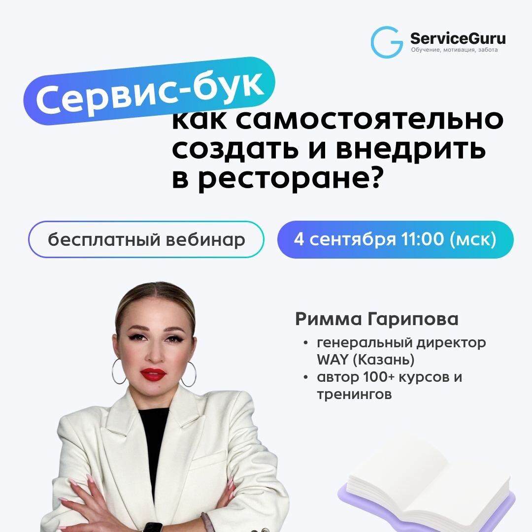 «Сервис-бук? Это для огромных сетей, нам не подходит» «Чтобы его составить, нужны консультанты и куча денег»… На самом деле, нет❗️Сервис-бук можно разработать и без привлечения экспертов. А результатом станет управляемый сервис, лояльная команда без хаоса и довольные гости, которые возвращаются✨. Как самостоятельно создать и внедрить сервис-бук в ресторане, расскажем на бесплатном вебинаре. 🗓4 сентября в 11:00 (мск) Спикер - Римма Гарипова🎙 , ресторатор с 20-летним опытом, ген.директор гастропространства WAY(Казань), спикер Novikov Space, автор курсов и 100+ тренингов для команд ресторанов . В прямом эфире обсудим: ✅ Что прописать в сервис-буке, чтобы он точно работал? ✅ Пошаговый план создания и внедрения без привлечения консультантов ✅ Контроль сервиса и работа над ошибками ✅ Как сделать сервис-бук частью корпоративной культуры? 📎Регистрируйтесь сейчас и получите 📄Чек-лист по внедрению стандартов сервиса в ресторане