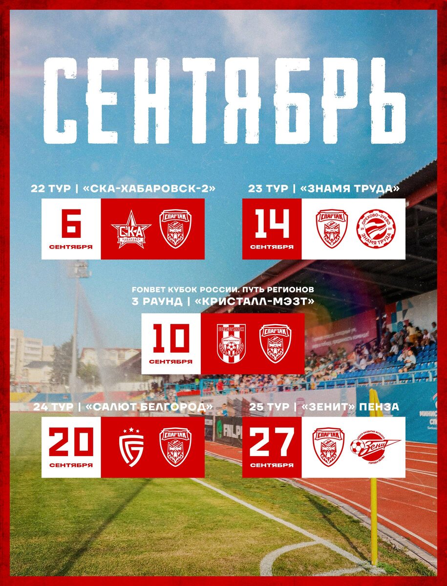 📌Сохраняем расписание матчей красно-белых на сентябрь
