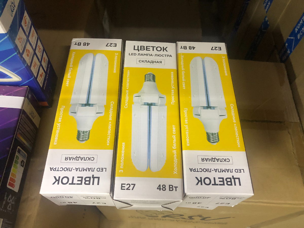 LED лампа-люстра Цветок. Она складная. Конструкция с тремя складными лопастями позволяет регулировать направление света. Лампа светит холодным белым светом. Цветовая температура 6500 К. Цоколь Е27. Мощность 48 Вт. Благодаря светодиодной технологии светильник экономичен и долговечен. Холодный свет не утомляет глаза и хорошо подходит для чтения и работы. Изготовитель Китай. Цена 272 рубля.