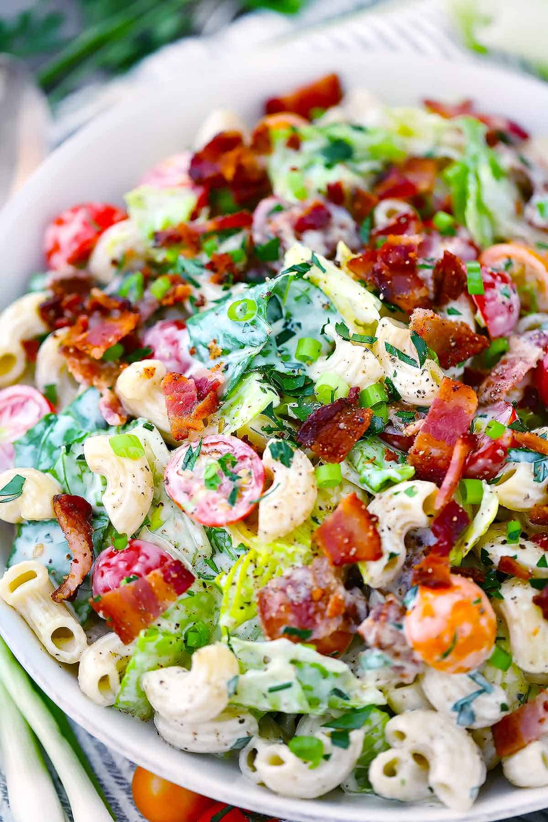 Этот рецепт салата с макаронами и беконом идеально подходит в качестве гарнира или основного блюда и заправлен пикантной сливочно-чесночной заправкой с травами на основе майонеза. Его легко приготовить заранее для совместных обедов, пикников или барбекю, а на приготовление уходит всего 25 минут! В этом рецепте салата с макаронами есть всё, что вы любите в сэндвичах с беконом, салатом ромэн и помидорами: толстый ломтик бекона, хрустящий салат ромэн и сладкие помидоры, заправленные сливочным соусом на основе майонеза. Вам понравится, как легко готовится это блюдо и какой у него восхитительный вкус! Для этого простого рецепта вам понадобится всего одна миска и 25 минут. Пока бекон готовится, вы можете сэкономить время и подготовить остальные ингредиенты, а также смешать заправку. Приготовьте этот простой салат с макаронами, беконом, салатом и томатами на следующем барбекю или вечеринке — он идеально подойдёт для пикника с друзьями. Этого рецепта хватит на 8–10 порций в качестве гарнира;