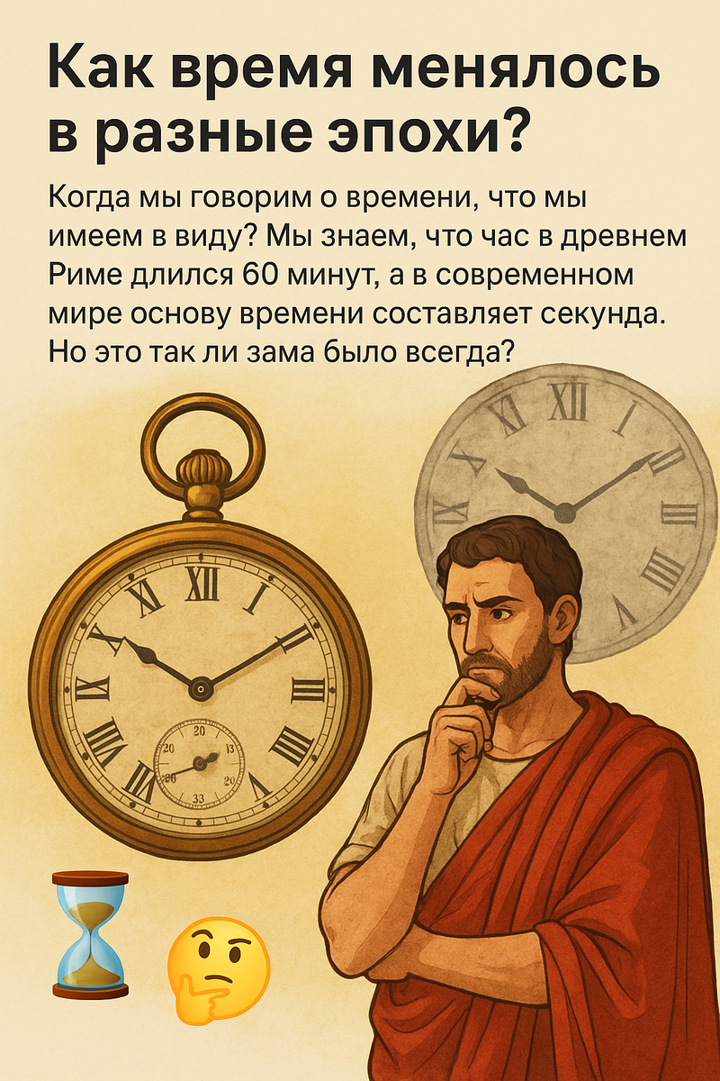 Когда мы говорим о времени, что мы имеем в виду? Мы знаем, что час в Древнем Риме длился 60 минут, а в современном мире основу времени составляет секунда. ⏰ Но это так ли было всегда? 🤔 Время — это загадка, которая менялась на протяжении тысячелетий! Каждая эпоха имеет свой взгляд на то, как и зачем измерять время. Давайте отправимся в путешествие через столетия, чтобы понять, как эволюционировало наше восприятие времени. ⏳ В Древнем Египте и Месопотамии люди использовали солнечные часы и водяные часы, чтобы отслеживать время. Однако понятие точных часов тогда не существовало — время делилось на фазы дня. 🌞 Это были скорее ориентиры, чем чётко измеренные интервалы. Например, рабочий день начинался с восходом солнца и заканчивался с его закатом. 🌅 В Древней Греции философы, такие как Платон и Аристотель, задумались о времени как о концепте, связанном с изменениями в мире, но в их жизни оно не было связано с точным отсчётом. Время для них было абстракцией! 📚 Древний Рим стал одной из