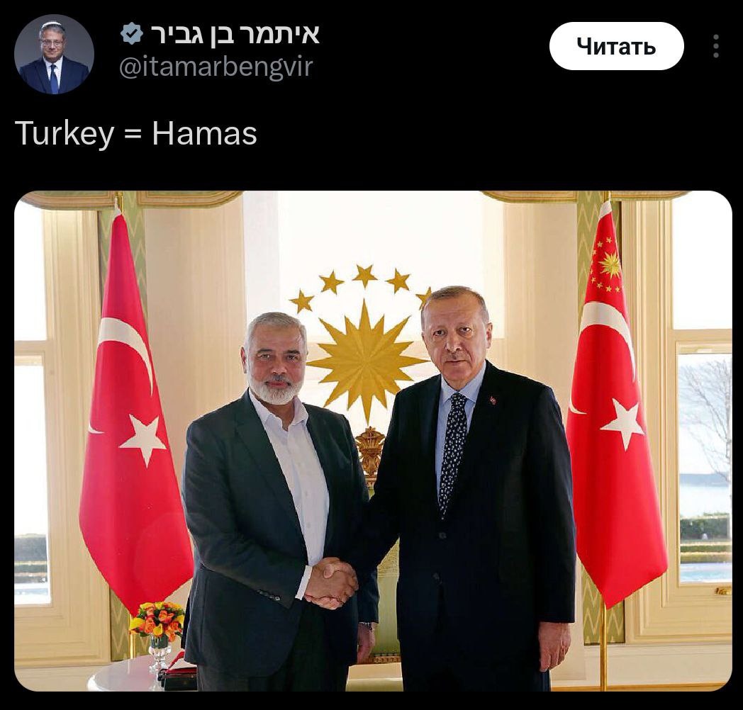 Министр нацбезопасности Израиля сравнил Турцию с террористами ХАМАС Под постом он опубликовал фото встречи Эрдогана с лидером ХАМАС. Ранее глава МИД Турции объявил о прекращении всех экономических и торговых связей с Израилем. @SPUTNIKBY