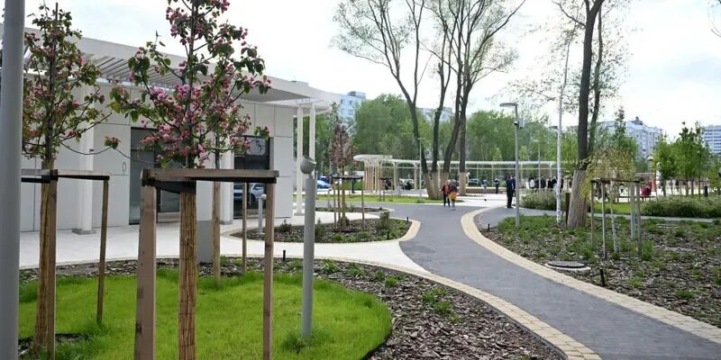 Новая часть прогулочной территории протянулась от спортплощадки до водоёма. Здесь оборудовали необычные пространства: павильон для лекций об экологии, пункт аренды специальных велосипедов для детей с ограниченными возможностями, площадку для изучения жестового языка, огород для совместных посадок и детскую игровую зону «Лесная квартира», сделанную из переработанного пластика.