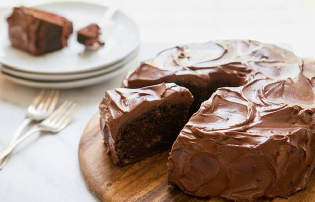 - Тем временем растопите 1/2 чашку темного шоколада на водяной бане. Смешайте со сметаной. С помощью кулинарной кисти смажьте торт на вершине и по краям получившейся смесью.