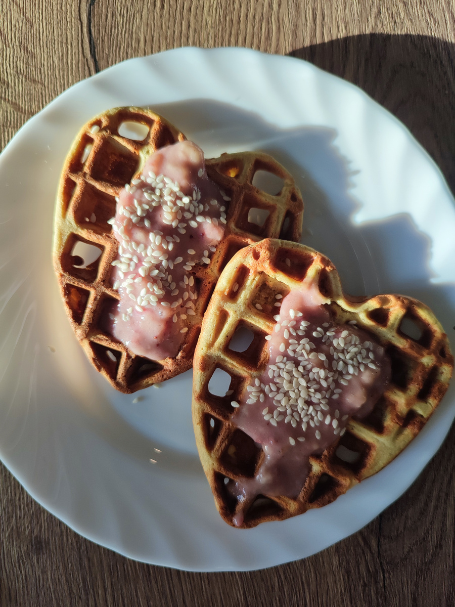 Здравствуйте! 👋 Сегодня я хочу предложить вам рецепт вафель из нутовой муки. Нут богат белком (целых 22,4 г на 100 г❗), витаминами В1, В6, В9, калием, магнием, фосфором, марганцем и медью. Вафли из нутовой муки получаются сытными, поэтому если ими позавтракать, энергии точно хватит на 3 часа до следующего приёма пищи. ИНГРЕДИЕНТЫ : 🔹Нутовая мука - 1 стакан 🔹Овсяное молоко - 1 стакан 🔹Соль по вкусу 🔹Сода - 1/3 ч.л. 🔹Льняной урбеч - 1 ч.л. 🔹Банан (большой) - 1 шт. 🔹Ягоды сезонные/замороженные 🔹Семена кунжута для украшения РЕЦЕПТ: 1️⃣ В большую миску высыпать нутовую муку, соль и соду. Хорошо перемешать. 2️⃣ В другой миске смешать 2/3 стакана тёплого овсяного молока и льняной урбеч, тщательно размешать почти до полного растворения урбеча. ▪️Перетёртые семена льна мы используем вместо яиц, чтобы тесто "схватилось". 3️⃣ Добавить жидкие ингредиенты в миску к сухим. Размешать венчиком до консистенции сметаны и оставить тесто настаиваться 10-15 минут. Пока ждём приготовим соус. 4️