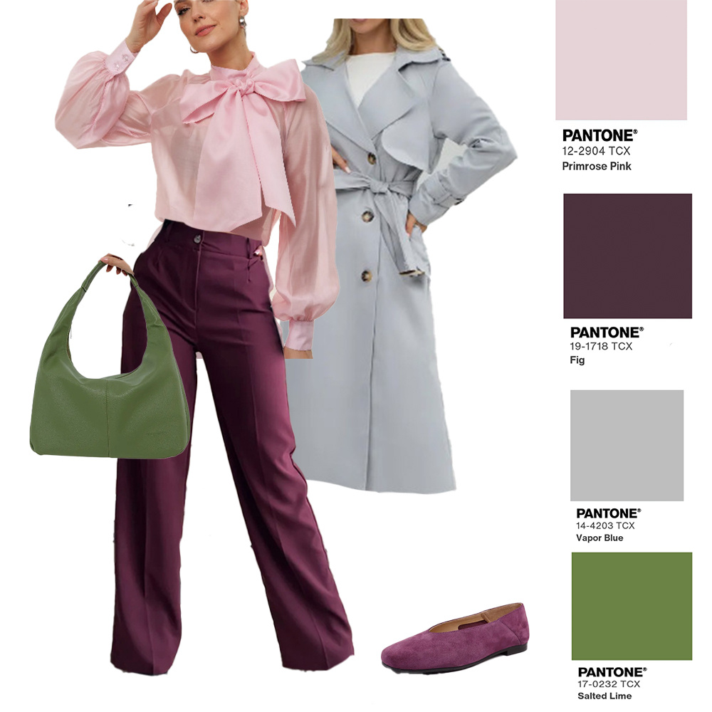 Образы сегодня подобрались яркие, на разный вкус и цветотип, при этом все комфортные для вот этого странного переходного периода из лета в осень. Мне даже трудно выбрать фаворита - так что каждая найдёт для себя что- то. Тем более, что их легко повторить- ведь все собрано на Wildberries и показано с артикулами для вашего удобства Женственность и нежность. Да, женственный образ можно собрать и без юбки или платья, добавив вот такую воздушную блуза с трендовым бантом. Он, кстати съёмный- модно носить и без него, либо перекинул как ленты вокруг шеи. Ну, и гамма здесь шикарная- розовый со сливовым - монохром, сумка контрастная, серый плащ- ахроматичен и все это ещё больше гармонизирует. Подойдёт идеально этот образ для девушек летних цветотипов. Напомню, что обувь в цвет брюки визуально удлиняет ноги, даже если это балетки. Артикулы: блуза 329951652, брюки 331525513, балетки 403407091, плащ 249070326, сумка 320286932 Этот же зеленый прекрасно "дружит" с оттенками коричневого, которых в э