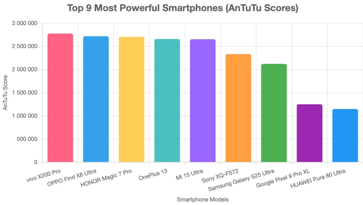 Меня очень попросили сравнивать флагманы не только по фото, но и по другим функциям. Начнем с самого главного - производительность. Изучаем график и скриншоты. Если в телефоне есть производительный режим - я использовал его. - vivo X200 Pro: 2,775,921 - OPPO Find X8 Ultra: 2,719,220 - HONOR Magic 7 Pro: 2,705,987 - OnePlus 13: 2,659,212 - Mi 15 Ultra: 2,653,517 - Sony XQ-FS72: 2,333,011 - Samsung Galaxy S25 Ultra: 2,121,736 - Google Pixel 9 Pro XL: 1,250,396 - HUAWEI Pura 80 Ultra: 1,147,589 Как вам результаты? По каким критериям можно еще сравнить флагманы?