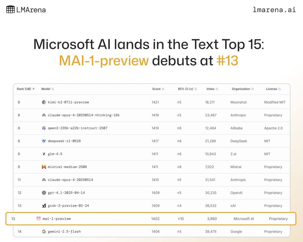 📱 Microsoft AI представила первую языковую модель mai-1-preview. В рейтинге LMArena она на 13-й позиции, рядом с Grok 3, Gemini 2.5 Flash и GPT-4.1. Интересно, что линейка моделей phi создаётся не Microsoft AI, а Microsoft Research. Подробности о mai-1-preview скудные: известна только архитектура «смесь экспертов» и использование 15 тыс. GPU Nvidia A100 для обучения. Также анонсировали голосовую модель mai-voice-1. ➡️Попробовать mai-1-preview можно на LMArena, скоро обещают API-доступ и интеграцию в Copilot. NeuroFlux #MicrosoftAI #ИИ #ЯзыковаяМодель #LMArena #Copilot