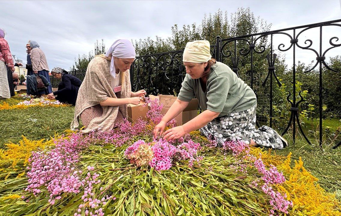 В святые успенские дни к чину Погребения Божией Матери Дивеевская обитель готовится особо. У нас сложилась традиция украшать святую Канавку свежескошенной травой и ковром из цветочных композиций. Все участники этого дела – сестры, флористы, паломники и прихожане с детьми – стараются внести в него частичку своего сердца и послужить своими трудами Божией Матери. Многие люди вечером накануне и утром в день украшения принесли цветы для украшения святой Канавки, и с самого утра начались подготовительные работы: в сквере в конце святой Канавки сестры и помощники принимали цветы, обрезали их, обрывали головки, сортировали по коробкам, в поле косили траву и рвали золотарник.